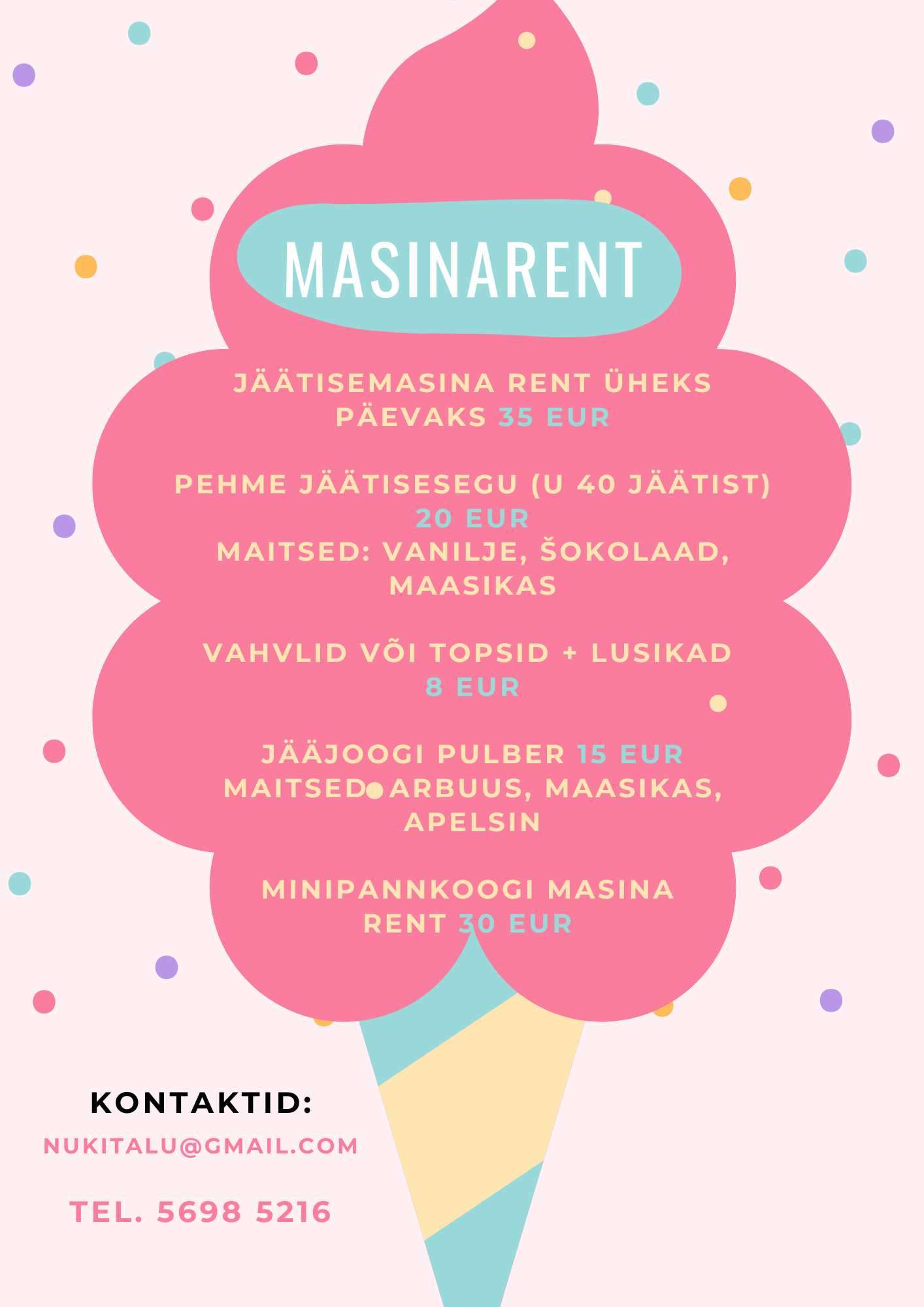 Pehme jäätis Suvekuude ilusatel ilmadel müüme oma koduhoovis Nuki talus pehmet jäätist ja osaleme ka erinevatel laatadel ja üritustel. Suurematele maiasmokkadele pakume ka jäätisemasina ja minipannkoogimasina renti Kihnus ja Pärnus. Share this: Share on X (Opens in new window) X Share on Facebook (Opens in new window) Facebook Like Loading...